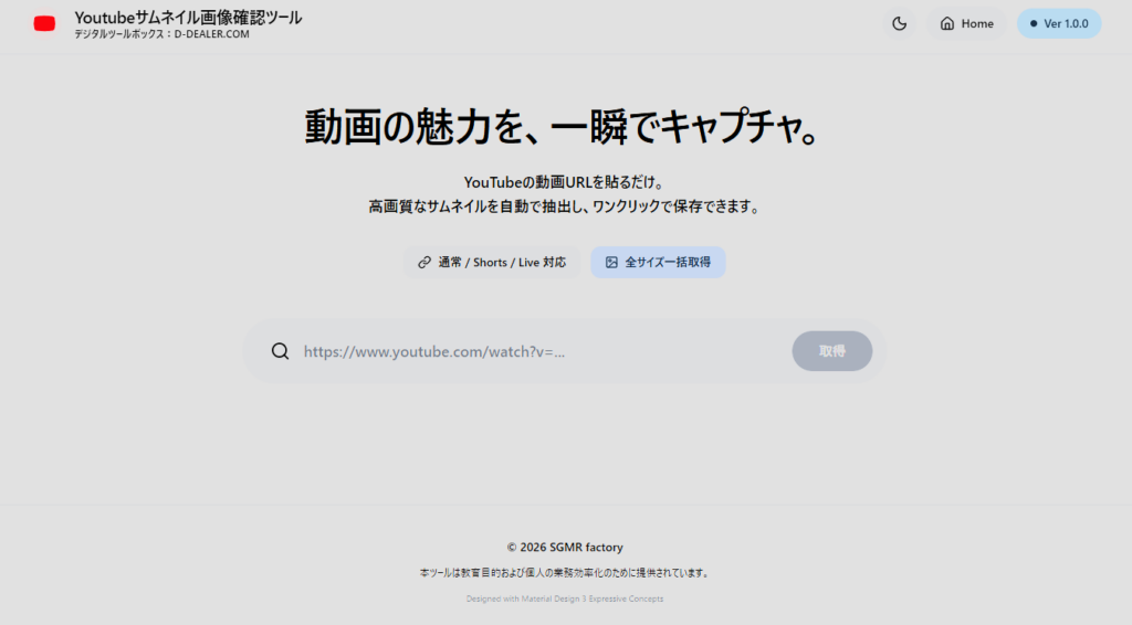 通常の動画URL (youtube.com/watch?v=...) だけでなく、短縮URL (youtu.be/...) や、Shorts動画、Live配信のURLをそのまま貼り付けても自動で認識して画像を取得します。